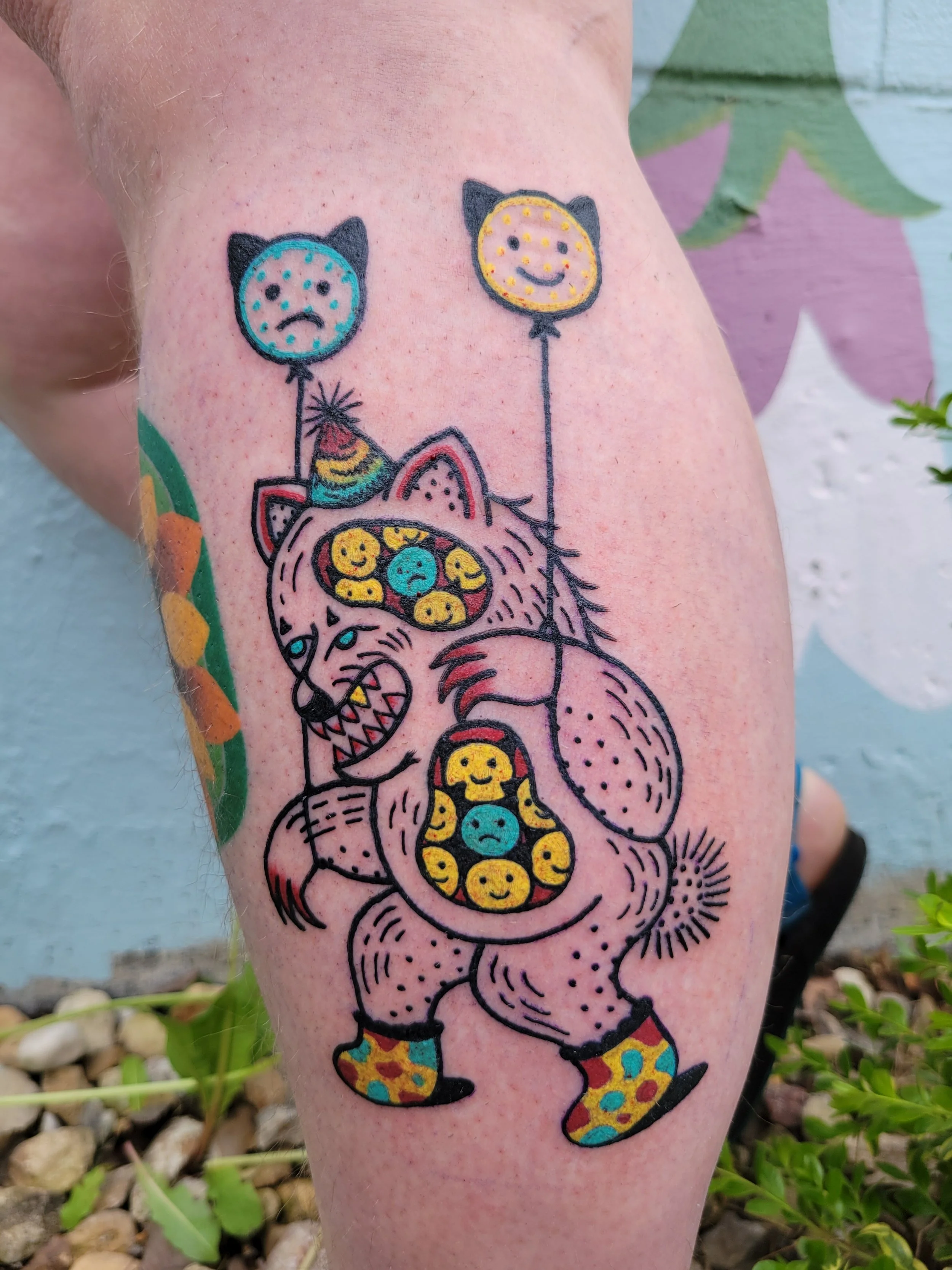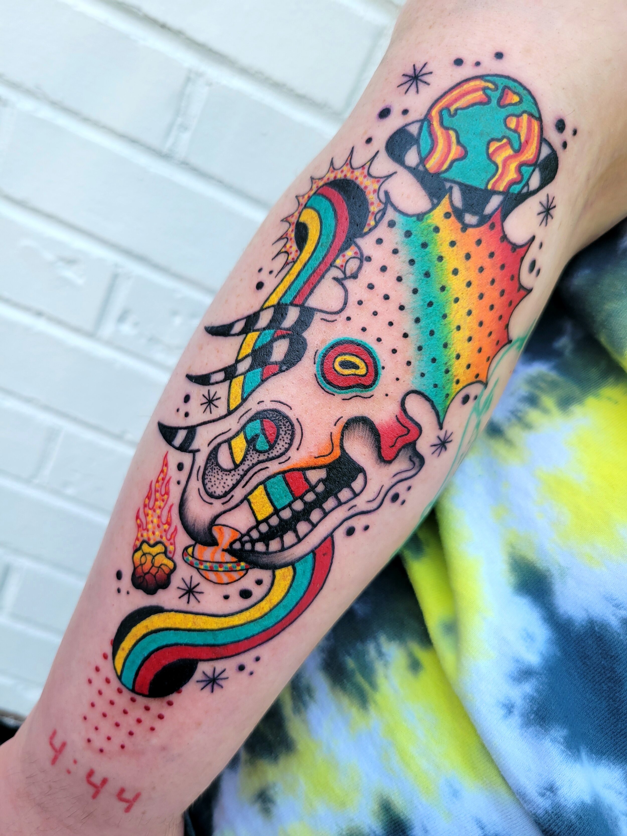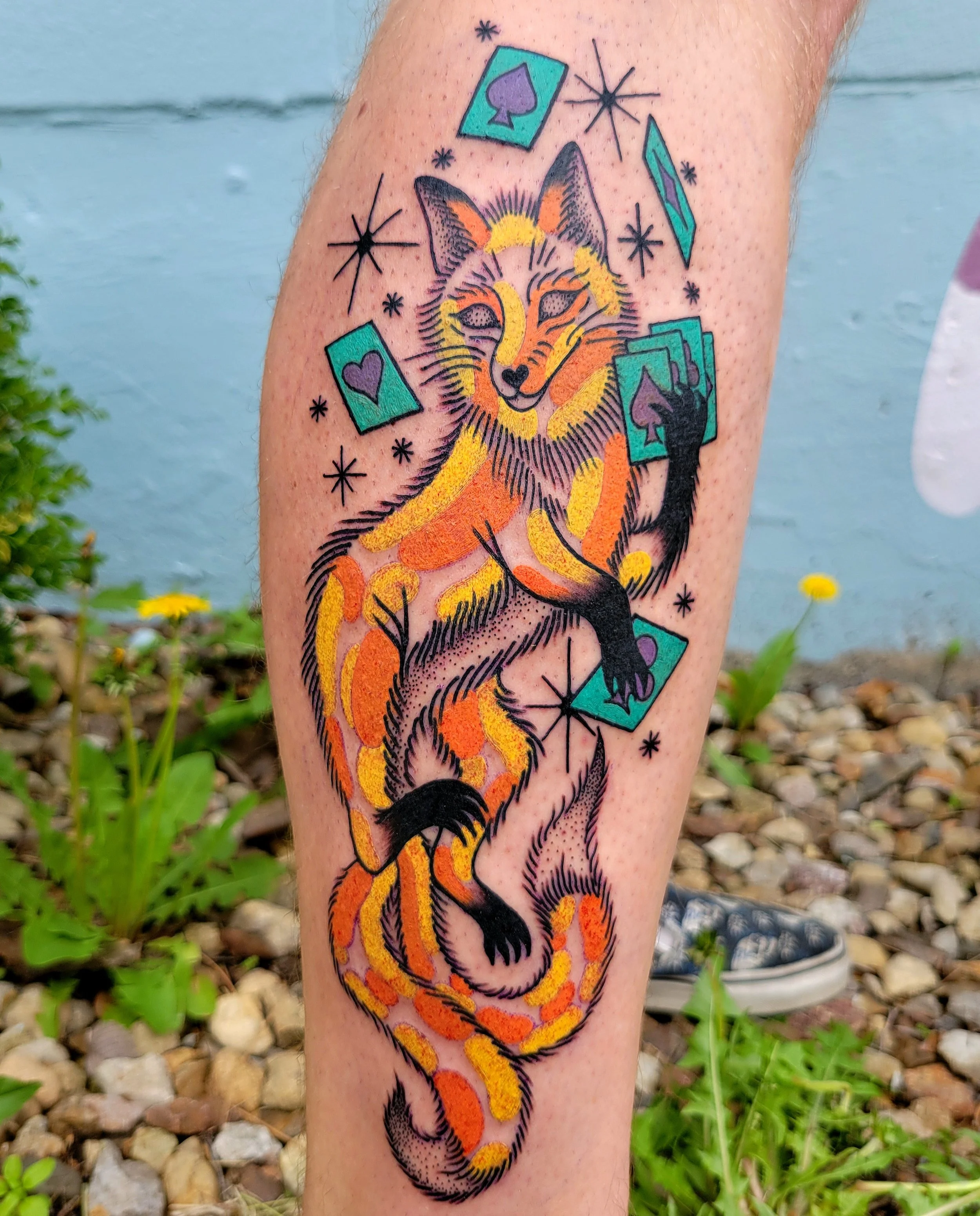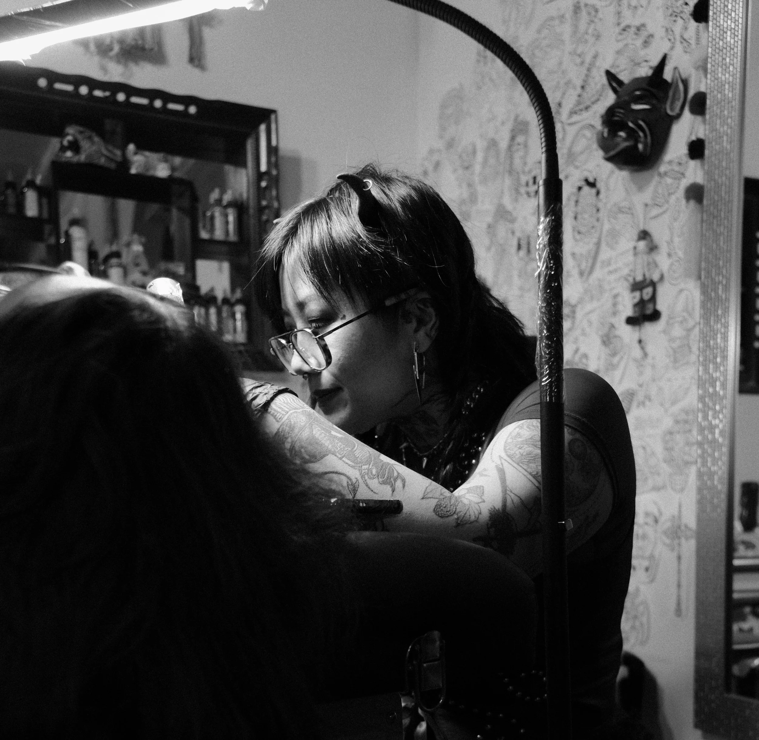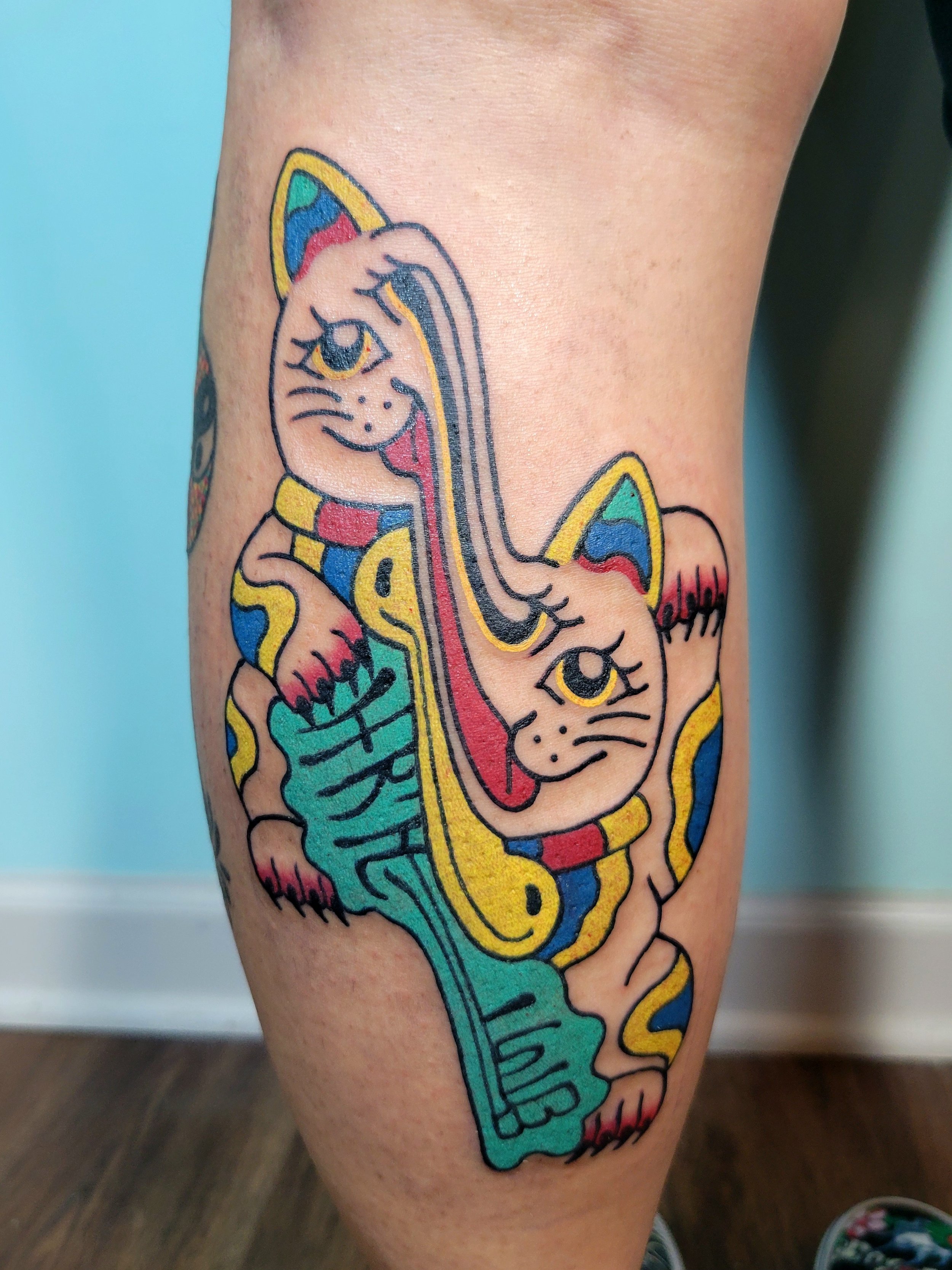 Cat grew up in North KCMO and have been tattooing since 2018. They love a variety of styles by are mostly focused on trippy, colorful imagery and heavy or fine-line blackwork. When they’re not tattooing you can find them traveling or playing magic the gathering with their partner.