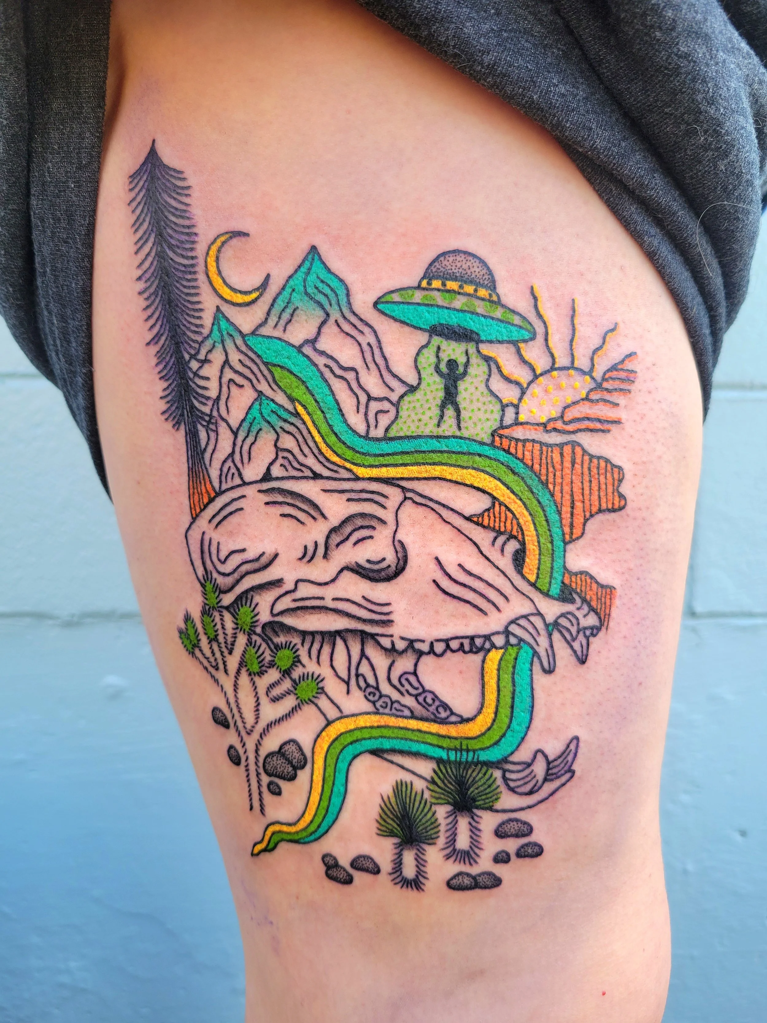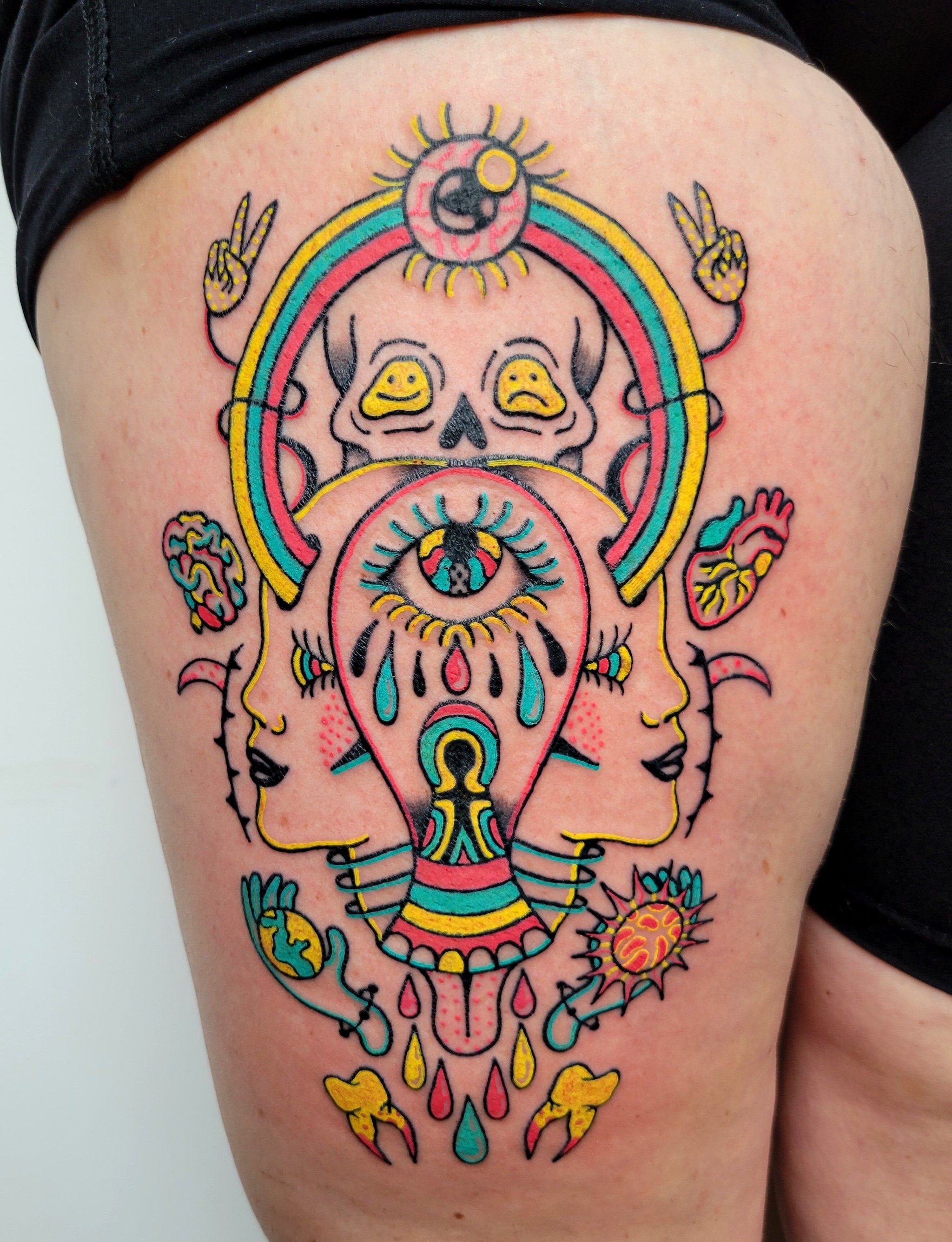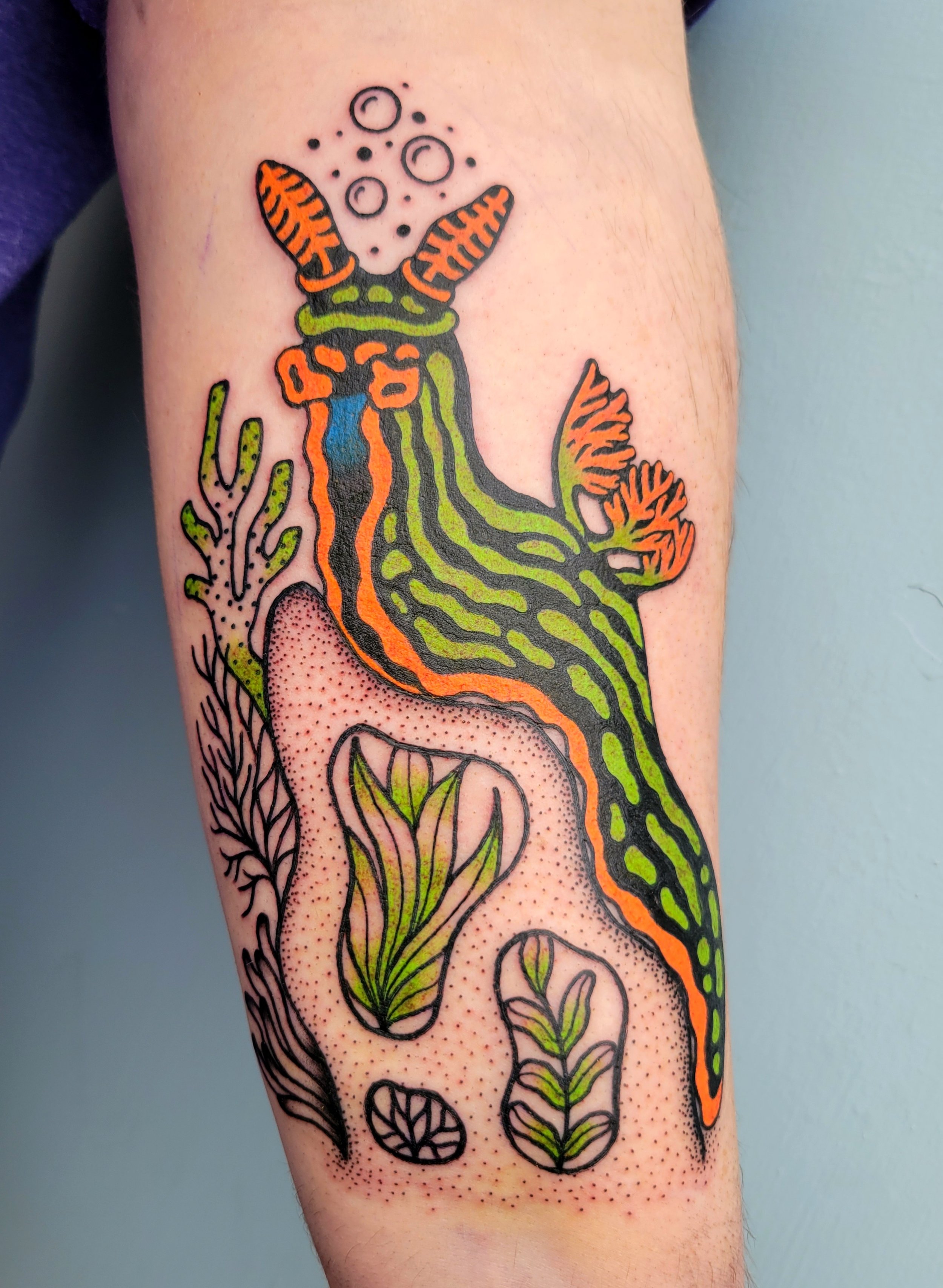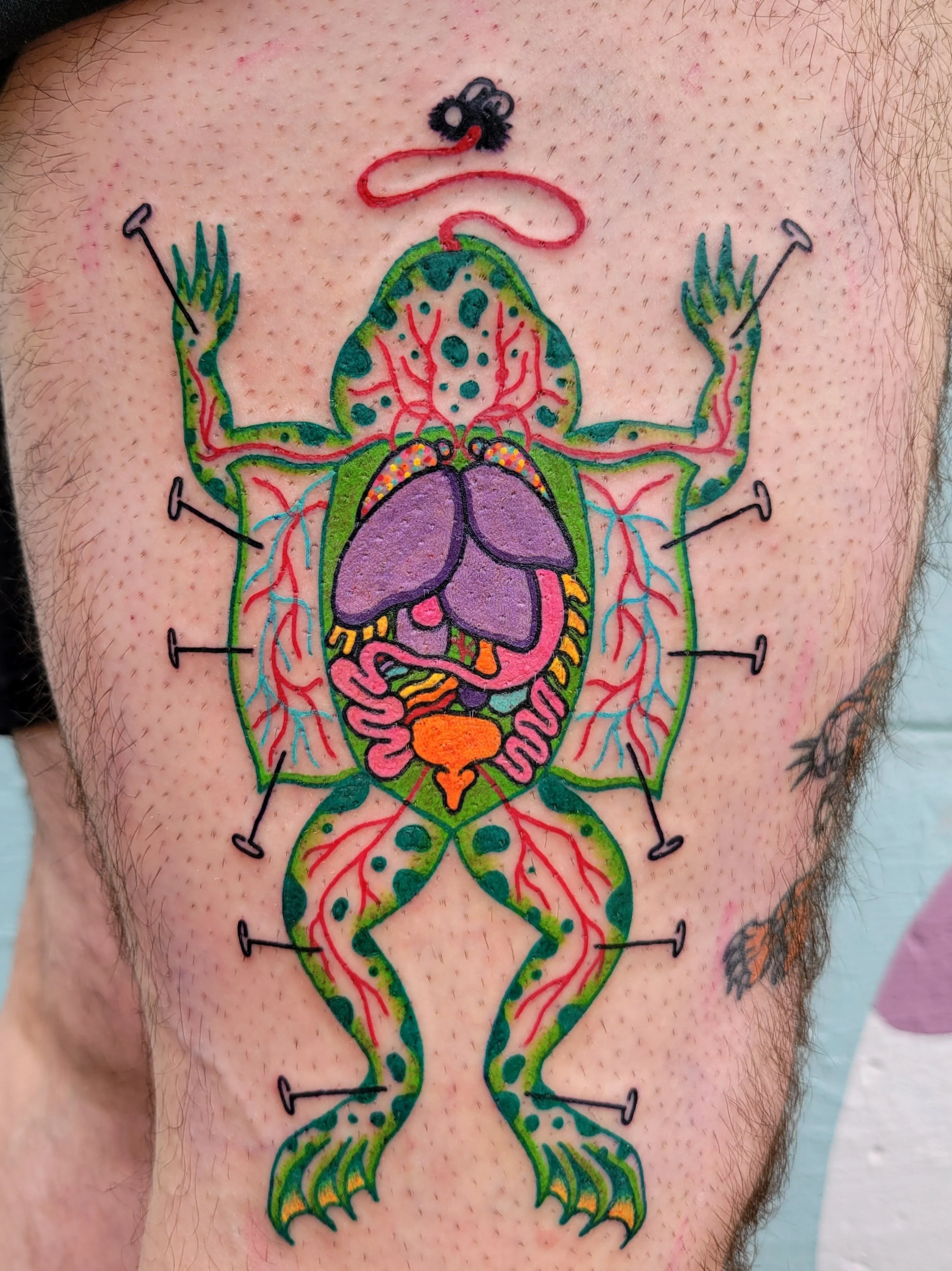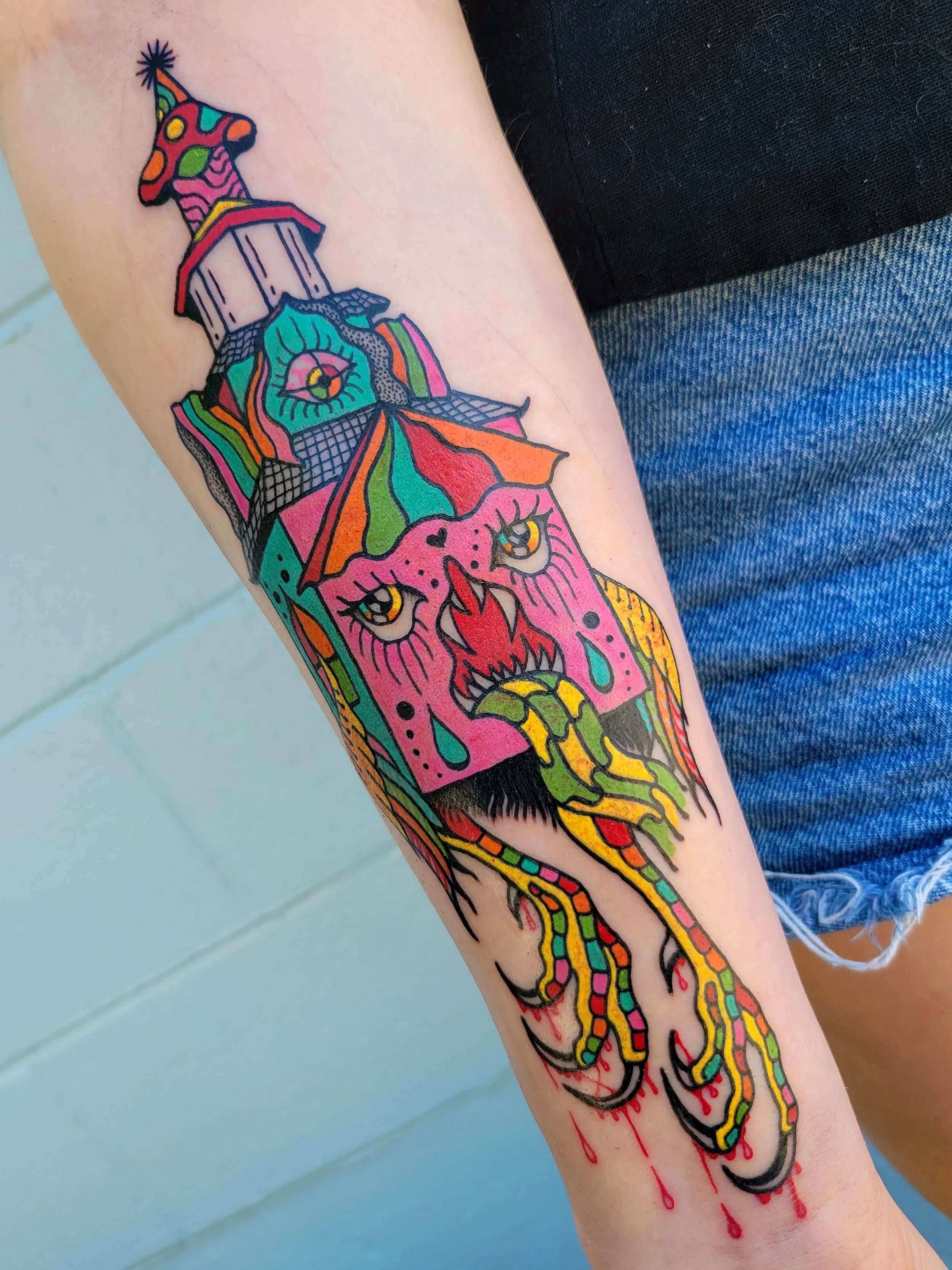 Cat grew up in North KCMO and have been tattooing since 2018. They love a variety of styles by are mostly focused on trippy, colorful imagery and heavy or fine-line blackwork. When they’re not tattooing you can find them traveling or playing magic the gathering with their partner.
